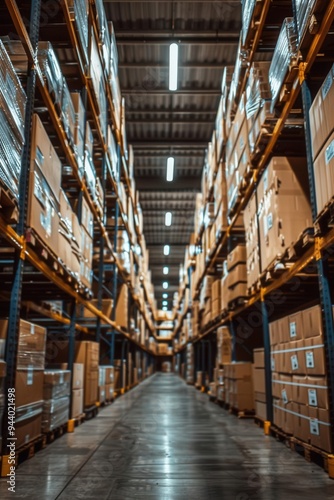 Warehouse interior featuring tall shelves with cardboard boxes, bright industrial lighting, eyelevel view, focus on the orderliness and space