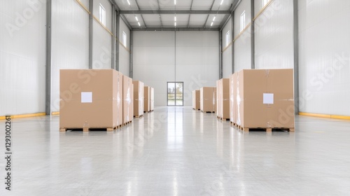 Warehouse interior, stacked cardboard boxes, industrial flooring, sunlight