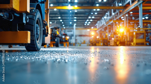 warehouse interior with machinery and illuminated floor, showcasing industrial activity
