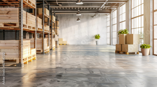 Warehouse interiors with ample spaces, natural light and copyspace.