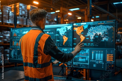 warehouse logistics scene with a worker in a high-visibility vest interacting with a futuristic control panel