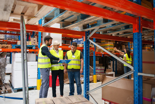 Warehouse meeting, managers and workers