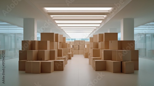 Warehouse Order: A tidy arrangement of cardboard boxes fills a bright, modern warehouse, demonstrating organized storage and efficient distribution. The scene reflects preparation, logistics.