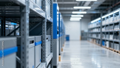 Warehouse Storage System with Organized Shelves and Inventory Boxes for Distribution and Logistics Management
