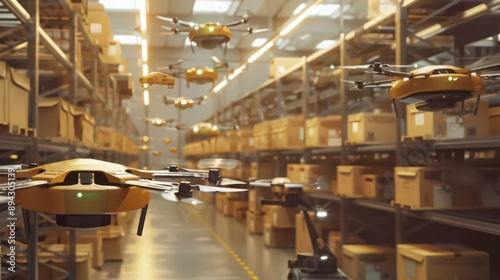 warehouse where drones and robotic arms manage inventory, demonstrating the speed and accuracy of automated logistics