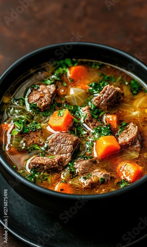 Warm and comforting shchi with beef, cabbage, and carrots served in a black bowl against an earthy background