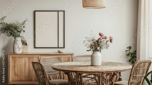 Warm and cozy dining room interior with mock up poster frame, round table, rattan chairs, beige commode, lamp, vase with flowers, kitchen cutboard and personal accessories. Home decor. Template.