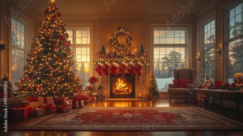 warm and inviting christmas living room scene with a beautifully adorned tree stockings hanging by the glowing fireplace evoking joy and a sense of family during the holiday season