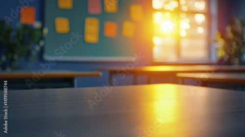 warm and inviting classroom scene with sunlight streaming through window, creating cheerful atmosphere
