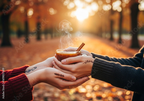 Warm autumnal drink shared between two people in a park.
