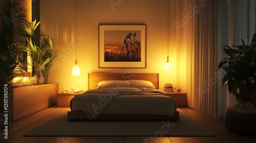 Warm bedroom interior with hanging lights and house plants creates a cozy atmosphere