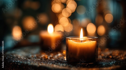 Warm blurred background glowing with golden candlelight over dark velvet ambience, soft reflections and graceful atmosphere, high-end visual with copy space.