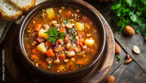 Warm bowl of soup with nuts and vegetables, perfect for a cozy meal