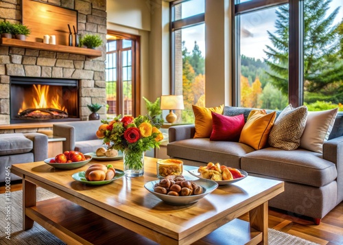 Warm fireplace light illuminates a modern sofa and a delicious meal.