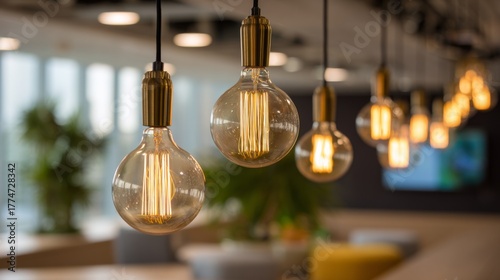 Warm Glow of Vintage Light Bulbs in Modern Office Setting, Illuminating Interior Space with Inviting Atmosphere, Perfect for Creative Work Environments