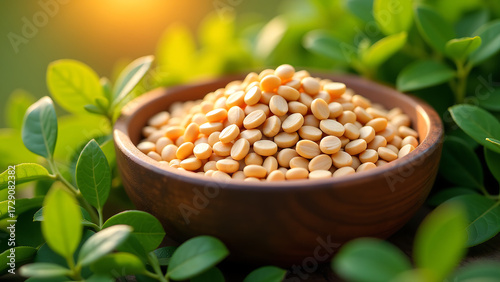 warm golden light bathes grain clusters rustic wooden bowl surrounded lush greenery inviting serenity harmony amidst nature