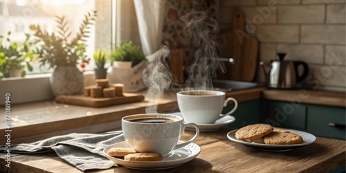 Warm morning coffee and freshly baked cookies on wooden table