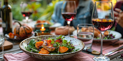 warm pumpkin salad with red wine on autumn table