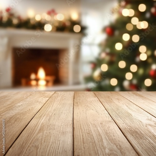 Warm Wooden Tabletop Christmas Scene with Blurred Fireplace and Decorated Tree