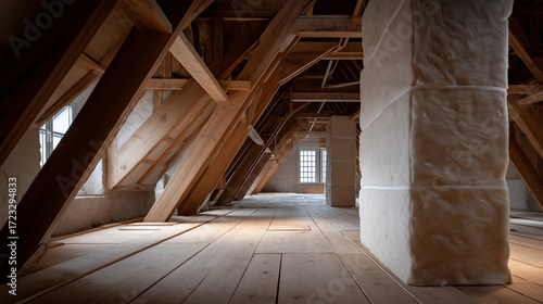 Warme Holzdachkonstruktion mit sichtbaren Balken und natürlicher Beleuchtung