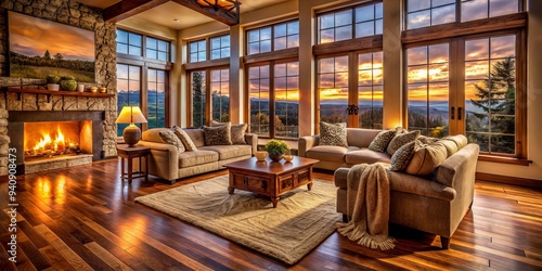 Warmly lit hardwood floor living room exudes cozy intimacy amidst gleaming wooden furniture, plush throw blankets, and soft evening lighting