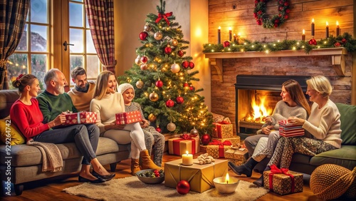 Warmly lit living room scene featuring decorated tree, wrapped gifts, and cozy fireplace, with loved ones gathered together sharing laughter and festive cheer.