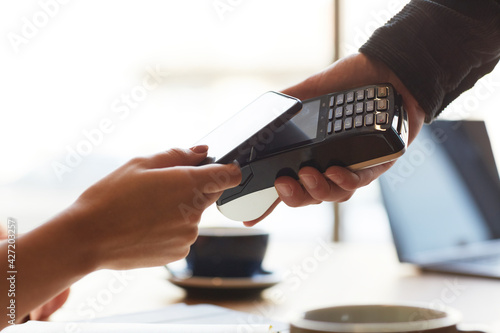 Warm-toned close up of unrecognizable customer paying via smartphone in cafe or coffee shop, copy space