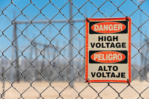 Warning Sign High Voltage for electrical transfer station on a chain link fence