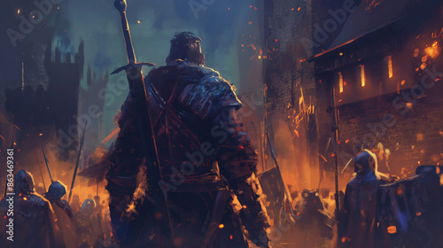 warrior characters in a fire medieval city background concept art