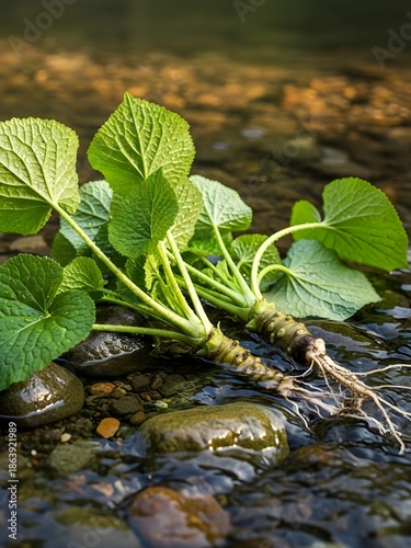 Wasabi plants growing in a mountain stream