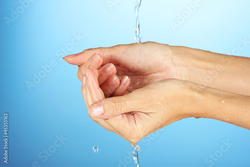 Washing hands on blue background close-up