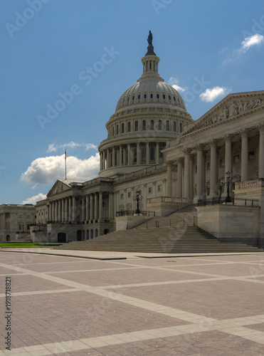 Washington DC Capitol building. Congress on Capitol Hill. American flag over Capitol. Historic USA architecture. United States government Capitol landmark. Senate and House in Washington.