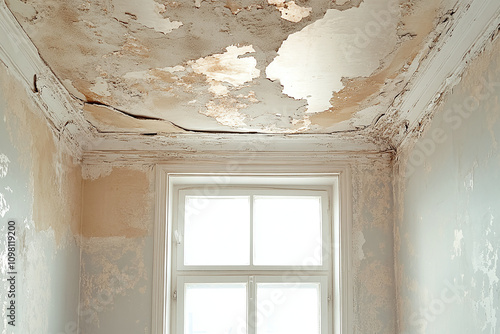 Water damage repair of ceiling showcasing a damaged and stained white ceiling with visible water marks and peeling paint. Indicating the need for restoration, insurance home policy
