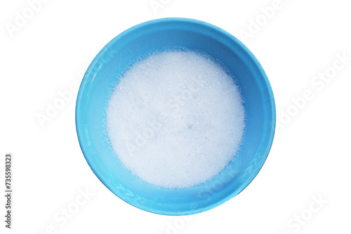 Water dissolved detergent with white foam bubble in blue basin