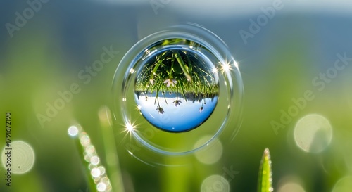 Water drop on grass reflecting green field