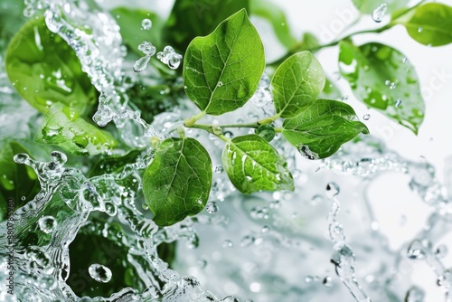 Water droplets falling on a leafy green plant, great for representing nature or science concepts