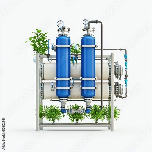 Water filtration system surrounded by green plants, designed for sustainability.