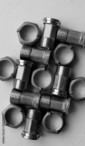 Water Plumbing Items. Water Meter Iron Fittings With Plumbing Nuts Laid Out Fitted Each Other Detailed View
