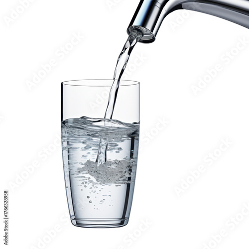 Water pouring from a faucet into a clear glass on a black background transparent background, png