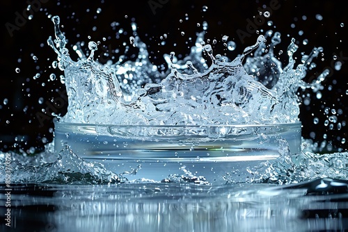 Water splash in a glass container with droplets in motion