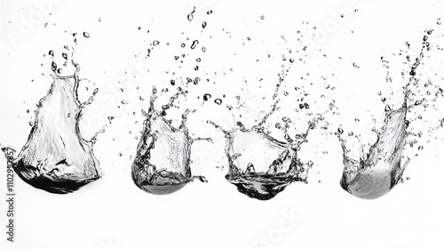 Water splashes captured in sequence on a white background showcasing dynamic movement and fluidity in a clean aesthetic
