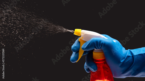 water sprayer bottle in a hand with gloves on a dark background with liquid spray. household items for home