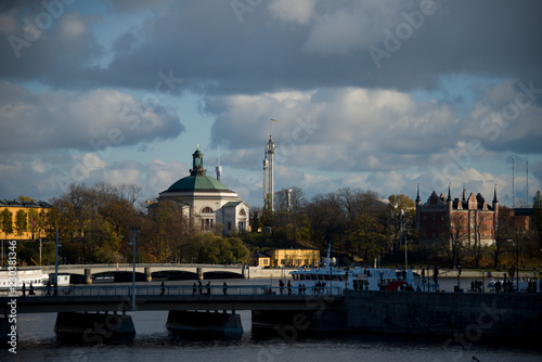Water view over Stockholm an late autumn day, snowy, sun and clear sky over boats and landmarks