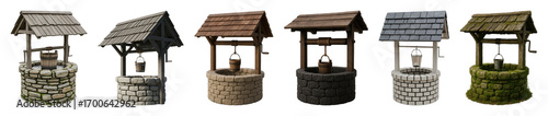 Water well set including stone, wooden, and weathered styles with shingle and slate roofs isolated. Rustic and fantasy architecture.