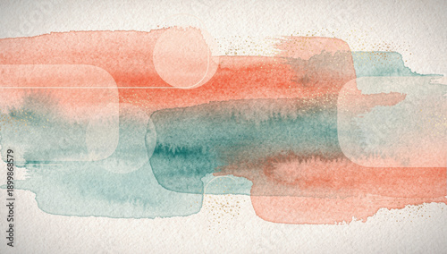 Watercolor abstract background with soft coral and teal brush strokes, textured paper, and subtle geometric shapes, creating calm and artistic atmosphere for creative design projects
