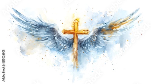 Watercolor angel wings with a gold cross Painting on white background, Holy spirit, Card, Invitation, Angelic, Church, Christian Art, Spiritual HD Wall art print