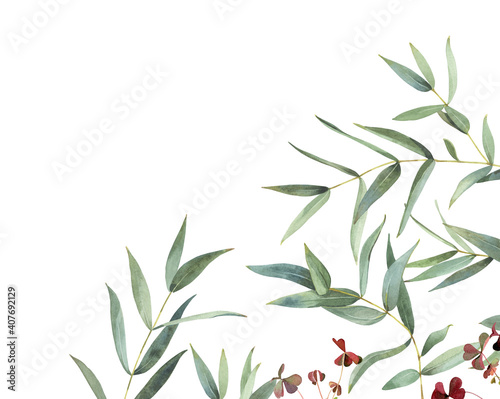 Watercolor composition of eucalyptus and oxalis leaves