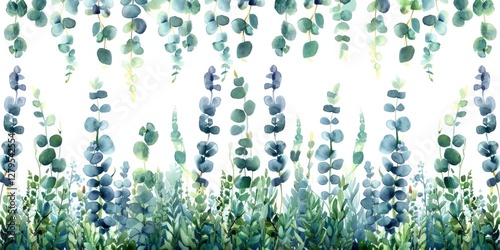 Watercolor Eucalyptus and Greenery Border on White Background