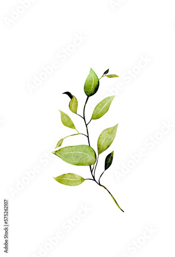 Watercolor green branch, botanical element isolated on white background