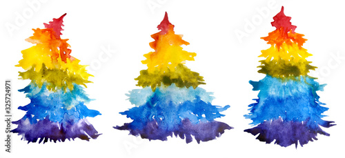 watercolor hand drawn illustration with three rainbow lgbtq flag Christmas trees for festive cards design paper textile gay pride holiday Happy new year with bright intense vibrant colors